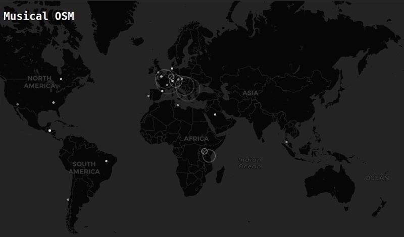 - Alex Chiu가 최근 오픈스트리트맵 편집 내역을 시청각적으로 시각화하는 웹 애플리케이션, Musical OSM을 개발했습니다. 오픈스트리트맵이 편집될 때마다 무작위 음이 재생됩니다.