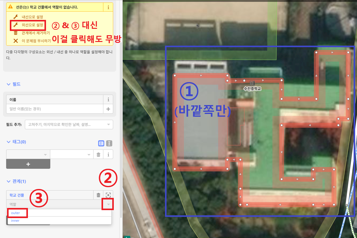 먼저 다중 다각형의 바깥쪽 선만 선택한 후, 관계 아래에 있는 '역할' 오른쪽의 화살표를 클릭하면 위와 같이 outer와 inner 중 하나를 선택할 수 있게 됩니다. 바깥쪽 선이므로 'outer'를 선택합니다.