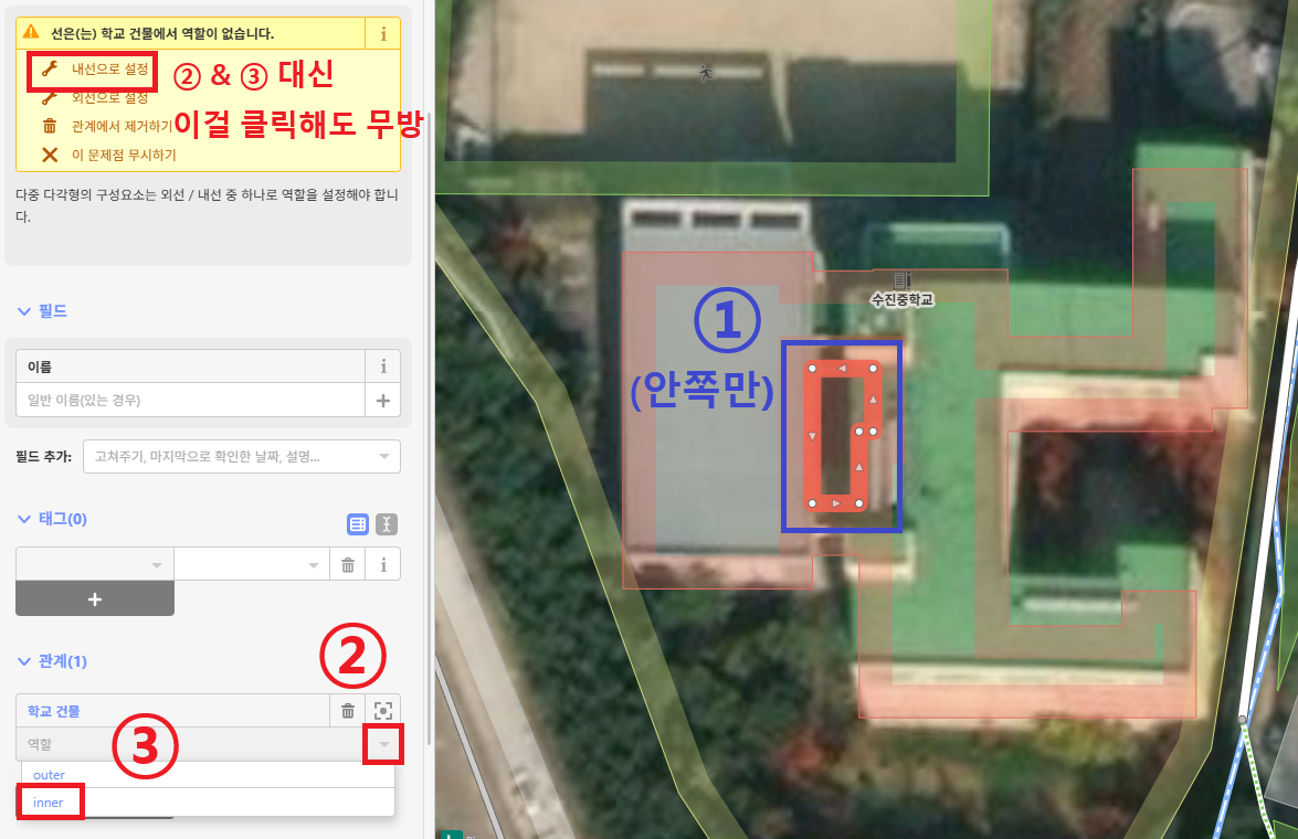 이번에는 다중 다각형의 안쪽 선만 선택한 후, 관계 아래에 있는 '역할' 오른쪽의 화살표를 클릭합니다. 안쪽 선이므로 'inner'를 선택합니다.