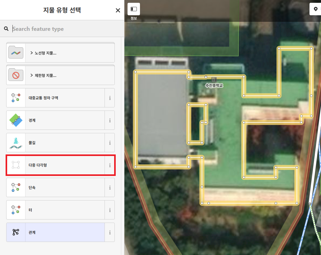 그러면 지물 유형을 선택할 수 있는 목록이 뜨는데, 맞는 유형을 선택하시면 됩니다.