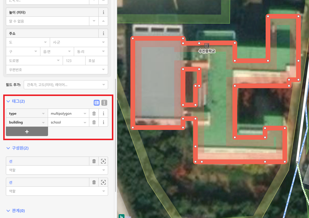 그러면 위 스크린샷과 같이 다중 다각형 태그(type=multipolygon)가 추가됩니다. 다만 이 상태에서 바로 업로드하면 안 되고, 어떤 선이 바깥쪽이고 어떤 선이 안쪽인지 수동으로 정해 줘야 합니다.