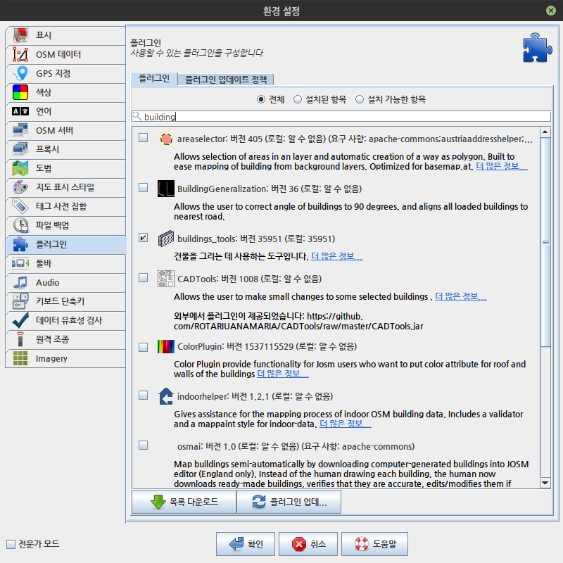 building_tools 플러그인 옆에 있는 체크박스를 선택하고 '확인'을 누르세요. 그러면 플러그인이 다운로드됩니다. building_tools 플러그인은 설치 후 JOSM을 재시작할 필요 없이 바로 사용할 수 있습니다.