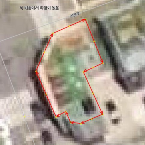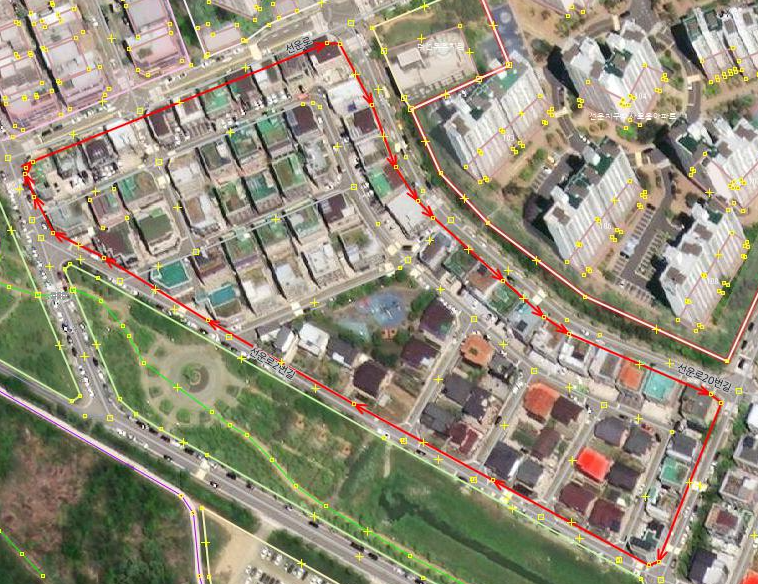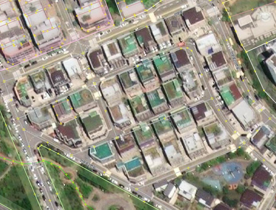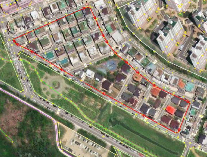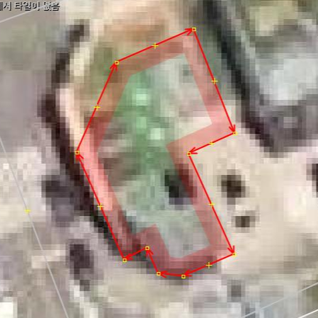 이때 영역 만들기(X) 또는 단축키 X를 누르고, 건물을 이루는 선 위에 마우스를 갖다 댄 뒤 더블클릭하면 위와 같이 점이 찍힙니다. 이렇게 찍은 두 점 사이의 선에 마우스를 갖다 대고 드래그하면 위와 같이 선이 평행하게 움직입니다. 이렇게 하면 직사각형 여러 개가 붙어 있는 모양의 건물(凸 모양)도 손쉽게 그릴 수 있습니다.
