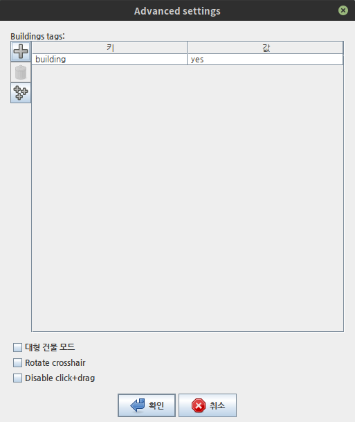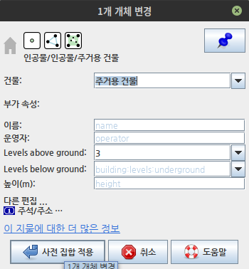 추가로 '고급...' 버튼을 누르면 위와 같은 창이 뜨는데, 여기서 건물을 그렸을 때 자동으로 붙일 태그를 변경할 수 있습니다. 이 기능을 잘 활용하면 건물뿐만 아니라 주차장, 공원, 태양광 발전기, 토지 이용 등 다양한 직사각형 구역을 손쉽게 그릴 수 있습니다.
