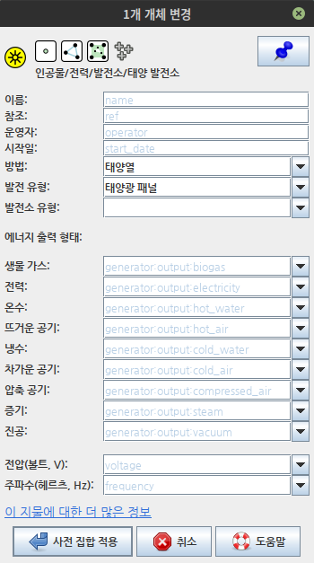 위와 같이 옥상 태양광 발전기를 그린 후, '사전 설정→인공물→전력→발전소→태양 발전소'를 선택합니다. 이후 방법: 태양광, 발전 유형: 태양광 패널을 선택합니다(만약 태양광 발전기가 아닌 태양열 발전기라면 그에 맞는 적절한 태그를 골라 주면 됩니다).