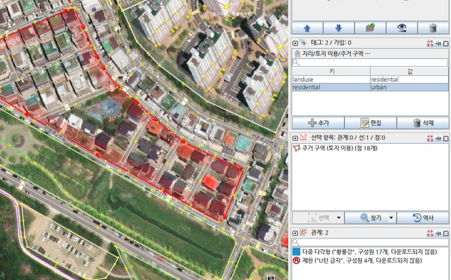 이 글에서는 도시의 구획 중 주거 구역을 오픈스트리트맵에 그리는 방법을 찬찬히 뜯어서 설명하도록 하겠습니다.