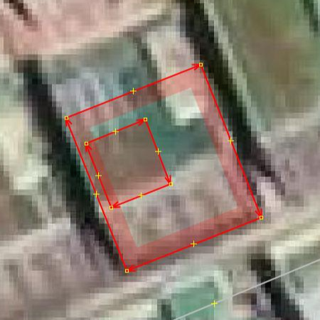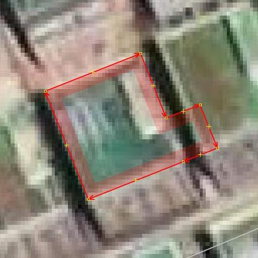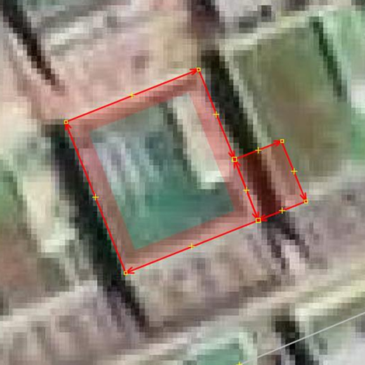 이때 건물은 도로는 물론이고, 주거 구역 경계선과 떨어져 있어야 합니다(경계선과 모서리를 공유하는 것까지는 괜찮습니다). 만약 경계선이 건물 한가운데를 통과하면 오픈스트리트맵 데이터를 소비하는 측이 문제를 겪을 수 있습니다.