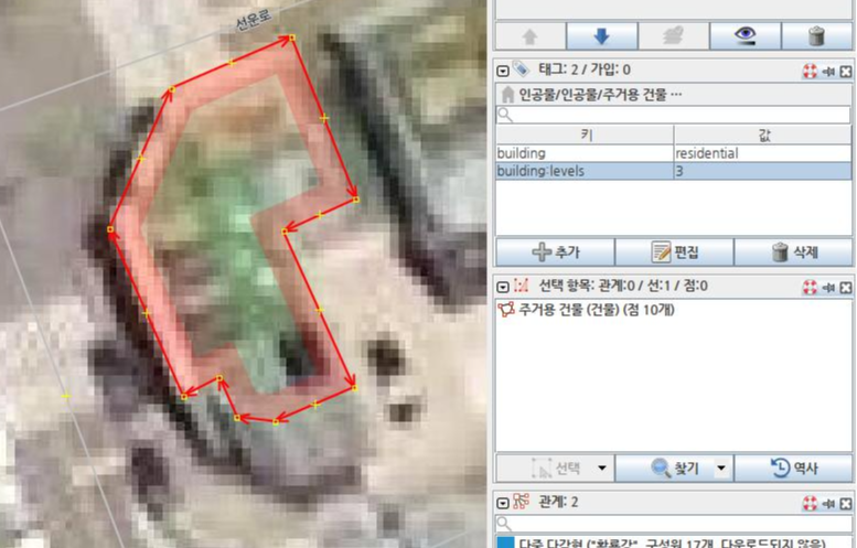 건물을 따라 그린 길을 선택합니다. 이때 아파트나 빌라와 같은 연립 주택에는 building=apartments 태그를 붙여 주세요. 설령 1층짜리 건물이더라도 연립 주택이라면 apartments 태그를 붙일 수 있습니다.