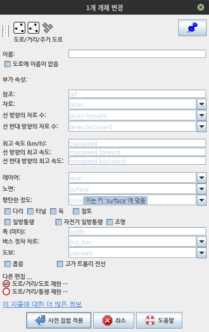 혹은 방금 그린 길을 선택하고, JOSM 상단의 '사전 설정→도로→거리→주거 도로'를 선택하면 위와 같은 창이 뜹니다. 모든 칸에 정보를 채울 필요는 없지만, 많이 채울수록 좋습니다. 가능한 만큼 정보를 채우고 '사전 설정 적용' 버튼을 클릭하세요. 그러면 적절한 태그가 자동으로 길에 부여됩니다. 이렇게 하면 태그를 일일이 외울 필요가 없습니다.