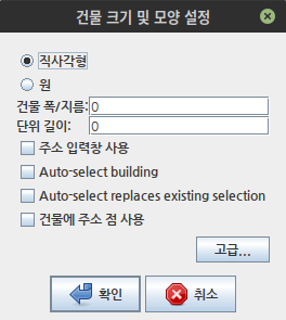 '데이터→건물 크기 설정' 또는 단축키 Ctrl+Alt+B를 누르면 위와 같은 창이 뜨는데, 여기서 원형 건물을 그리도록 설정할 수도 있고, 건물을 그릴 때마다 주소 입력창이 뜨도록 설정할 수도 있습니다.