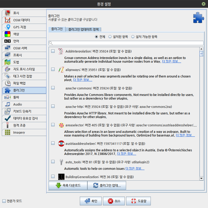JOSM 상단에서 '편집→환경 설정...→플러그인'으로 들어가세요. 플러그인 목록에 아무것도 뜨지 않는다면 '목록 다운로드' 버튼을 클릭하세요.