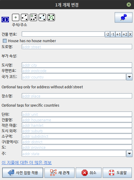 이때 '주석/주소...'를 클릭하면 건물의 주소도 입력할 수 있습니다. 한국에서는 맨 위의 '건물 번호'와 '도로명', 그리고 '우편번호'만 입력하면 충분합니다. 나머지 정보는 수많은 오픈스트리트맵 기여자 분들이 열심히 그려 놓은 행정 경계로부터 도출할 수 있습니다. 오히려 시군구 이상의 정보를 직접 입력해 주면 오픈스트리트맵 데이터베이스의 일관성이 떨어질 수 있습니다.
